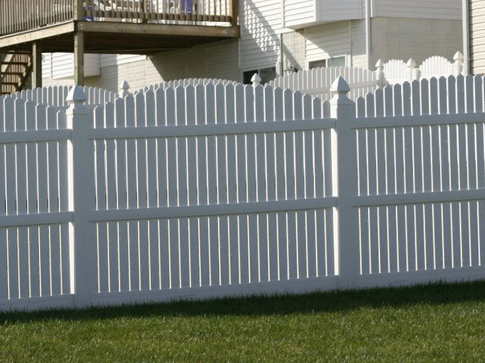A 6' overscallop vinyl picket fence provides the same functionality as a standard vinyl picket fence, with the added touch that only a scallop could provide. Each picket is cut to the correct height in order to ensure a seamless grade above the top rails.