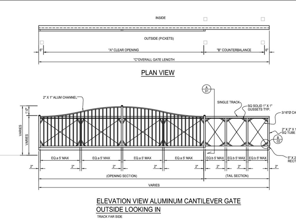 Ornamental cantilever gates are an excellent choice for providing a classy high profile entrance to any home or business. Ornamental gates use vertical pickets that are closely spaced to provide real security and appeal. Each gate is coated to provide a top-notch finish. Available in our standard manufactured styles or customized to your special design, a cantilever gate's overall length is usually one and a half the distance of the opening. So, if you have a 30’ opening; your gate is 45’ overall. You must account for this space along the fence where the gate stores. Aluminum ornamental cantilever gates use an aluminum square frame with an extruded track at the top. Trucks or trolleys are installed so that the trucks run inside the track to support the gate from the support posts. At the bottom, there are two guide wheels that keep the gate plumb and centered. Steel cantilever gates are very reliable and economic. Aluminum cantilever gates are definitely lighter, the rollers are enclosed and a great platform for an ornamental look. The enclosed track system is a much smoother operation during snow and ice storms. Our smooth overscalloped design provides a real point of entrance to any fene line. This design has an easy upward slope to teh center of the gate that provides a real look of class and elegance. *Please note that the gate picture represents a custom gate. Please refer to the style drawing for a more accurate representation of your gate.