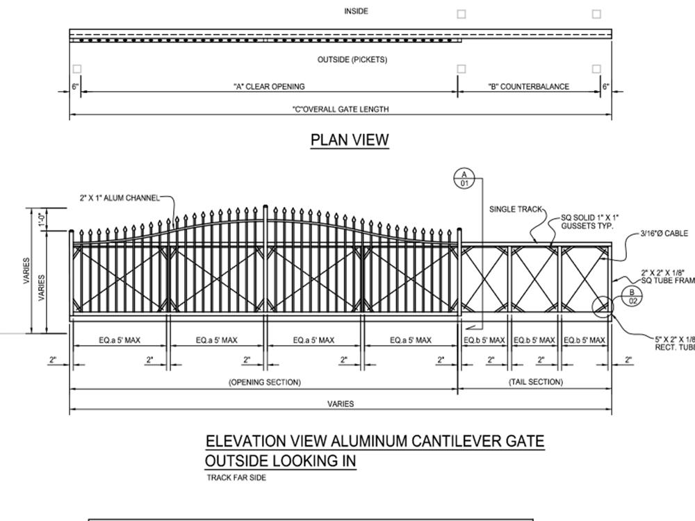 Ornamental cantilever gates are an excellent choice for providing a classy high profile entrance to any home or business. Ornamental gates use vertical pickets that are closely spaced to provide real security and appeal. Each gate is coated to provide a top-notch finish. Available in our standard manufactured styles or customized to your special design, a cantilever gate's overall length is usually one and a half the distance of the opening. So, if you have a 30’ opening; your gate is 45’ overall. You must account for this space along the fence where the gate stores. Aluminum ornamental cantilever gates use an aluminum square frame with an extruded track at the top. Trucks or trolleys are installed so that the trucks run inside the track to support the gate from the support posts. At the bottom, there are two guide wheels that keep the gate plumb and centered. Steel cantilever gates are very reliable and economic. Aluminum cantilever gates are definitely lighter, the rollers are enclosed and a great platform for an ornamental look. The enclosed track system is a much smoother operation during snow and ice storms. Our spear top overscalloped design provides a real point of entrance to any fene line. This design has an easy upward slope to the center of the gate that provides a real look of class and elegance while still maintaining real security. *Please note that the gate picture represents a custom gate. Please refer to the style drawing for a more accurate representation of your gate.