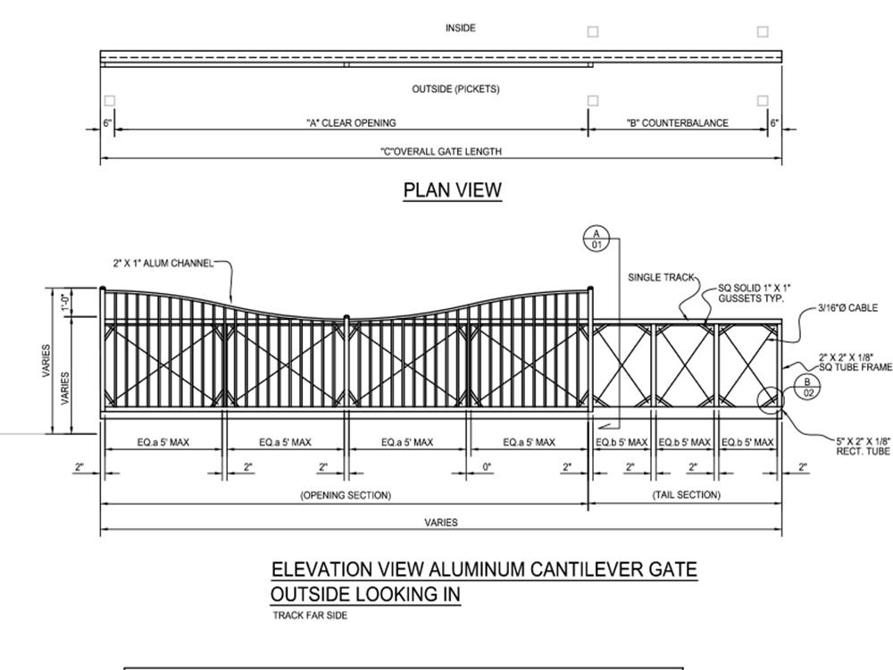 Ornamental cantilever gates are an excellent choice for providing a classy high profile entrance to any home or business. Ornamental gates use vertical pickets that are closely spaced to provide real security and appeal. Each gate is coated to provide a top-notch finish. Available in our standard manufactured styles or customized to your special design, a cantilever gate's overall length is usually one and a half the distance of the opening. So, if you have a 30’ opening; your gate is 45’ overall. You must account for this space along the fence where the gate stores. Aluminum ornamental cantilever gates use an aluminum square frame with an extruded track at the top. Trucks or trolleys are installed so that the trucks run inside the track to support the gate from the support posts. At the bottom, there are two guide wheels that keep the gate plumb and centered. Steel cantilever gates are very reliable and economic. Aluminum cantilever gates are definitely lighter, the rollers are enclosed and a great platform for an ornamental look. The enclosed track system is a much smoother operation during snow and ice storms. Our smooth underscalloped design provides a real point of entrance to any fene line. This design has an easy downward slope to the center of the gate that provides a real look of class and elegance. *Please note that the gate picture represents a custom gate. Please refer to the style drawing for a more accurate representation of your gate.